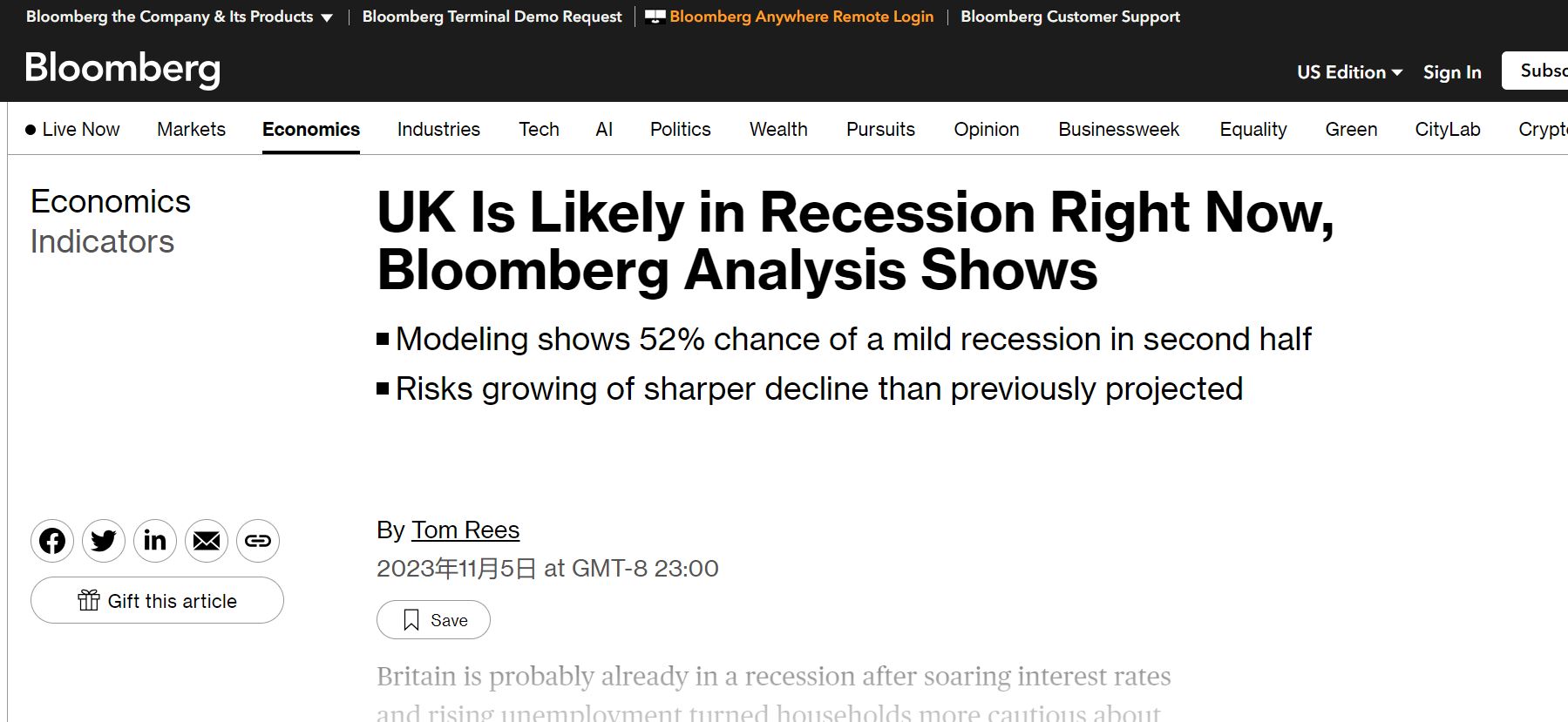 汇通财经APP讯——根据彭博经济研究公司的分析,由于利率飙升和失业率上升使家庭对支出更加谨慎,英国可能已经陷入衰退。
