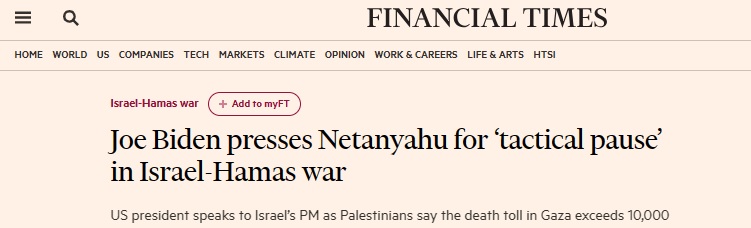 汇通财经APP讯——据英国《金融时报》周二(11月7日)最新报道,美国总统拜登(Joe Biden)周一敦促以色列总理内塔尼亚胡(Benjamin Netanyahu)同意在以色列与哈马斯的战争中“战术暂停”。目前,以色列军队已经包围加沙的主要城市,并对被围困的加沙地带进行猛烈轰炸。