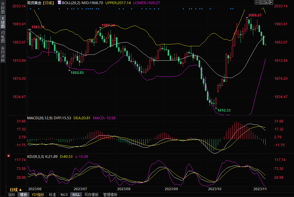 现货黄金周三收跌18.91美元/盎司,跌幅0.96%,收报1950.16美元/盎司。