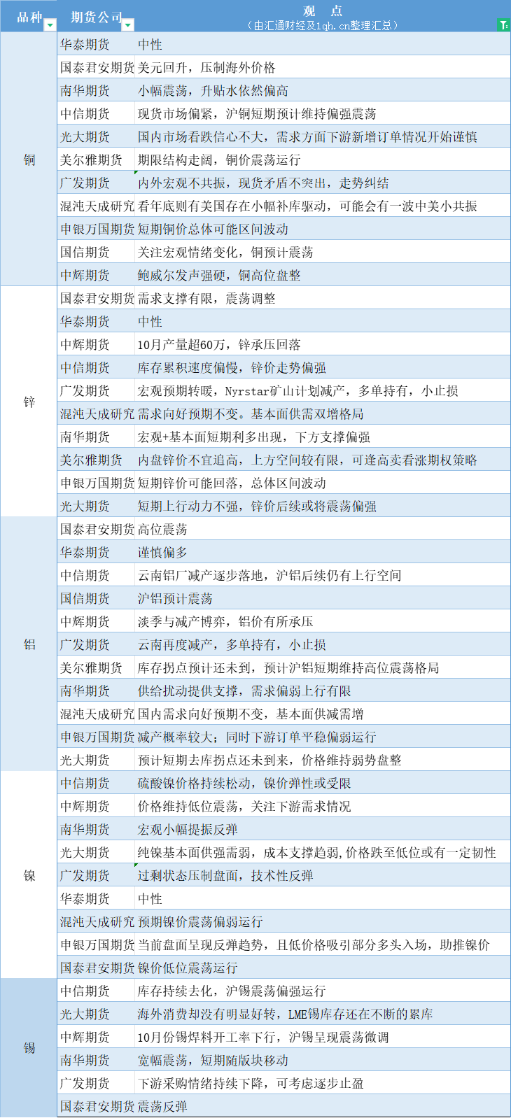 标题:期货公司观点汇总一张图:11月10日有色系(铜、锌、铝、镍、锡等)