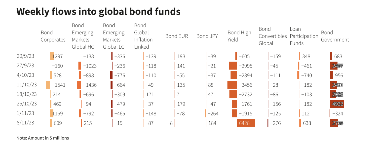 全球债券基金净买入 67.3 亿美元,打破了连续三周的资金流出。