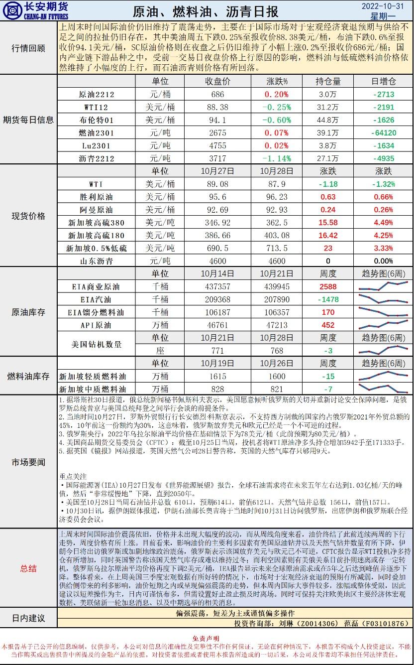 10月31日,长安期货发布原油早评,称美联储新一轮加息在即,衰退预期减弱下可寻求布多机会。日内建议:偏强震荡,短差为主或谨慎偏多操作。