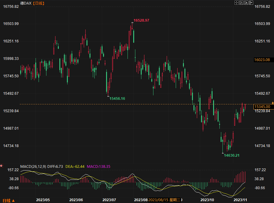 德国DAX30指数收盘上涨111.76点,涨幅0.73%,收报15346.15点;