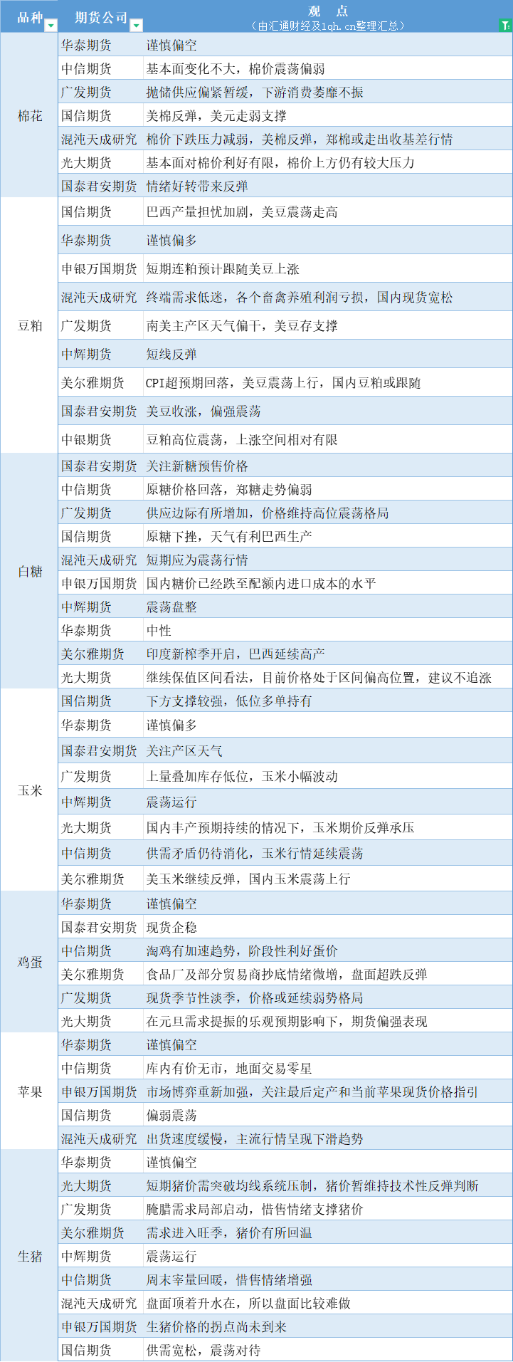 标题:期货公司观点汇总一张图:11月15日农产品(棉花、豆粕、白糖、玉米、鸡蛋、生猪等)