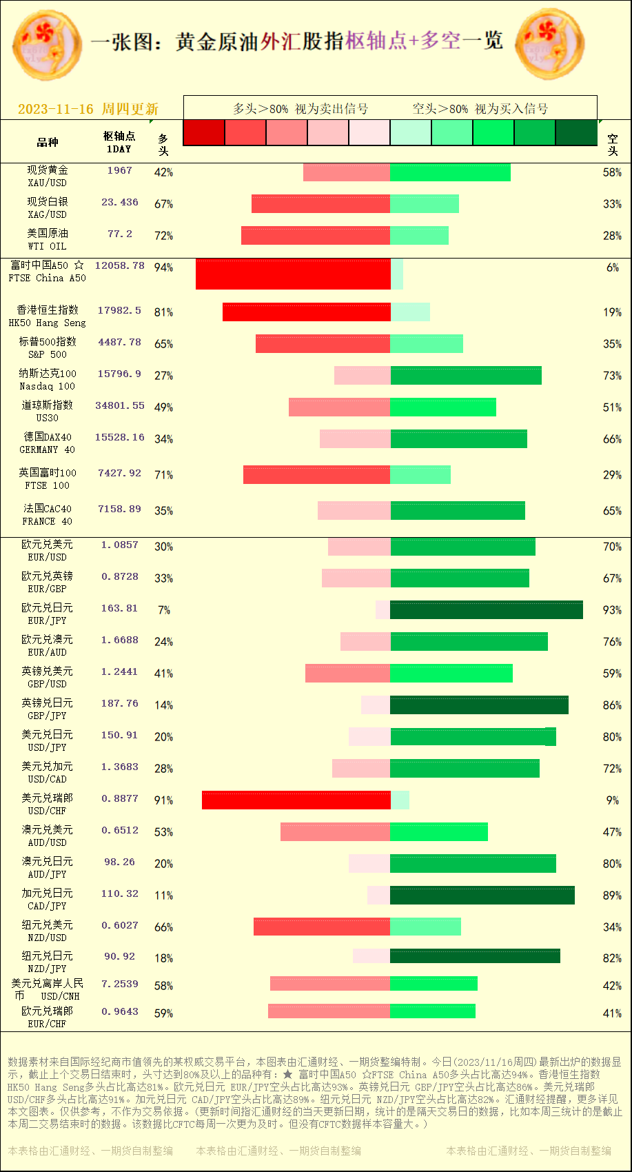 标题:一张图:2023/11/16黄金原油外汇股指"枢纽点+多空占比"一览