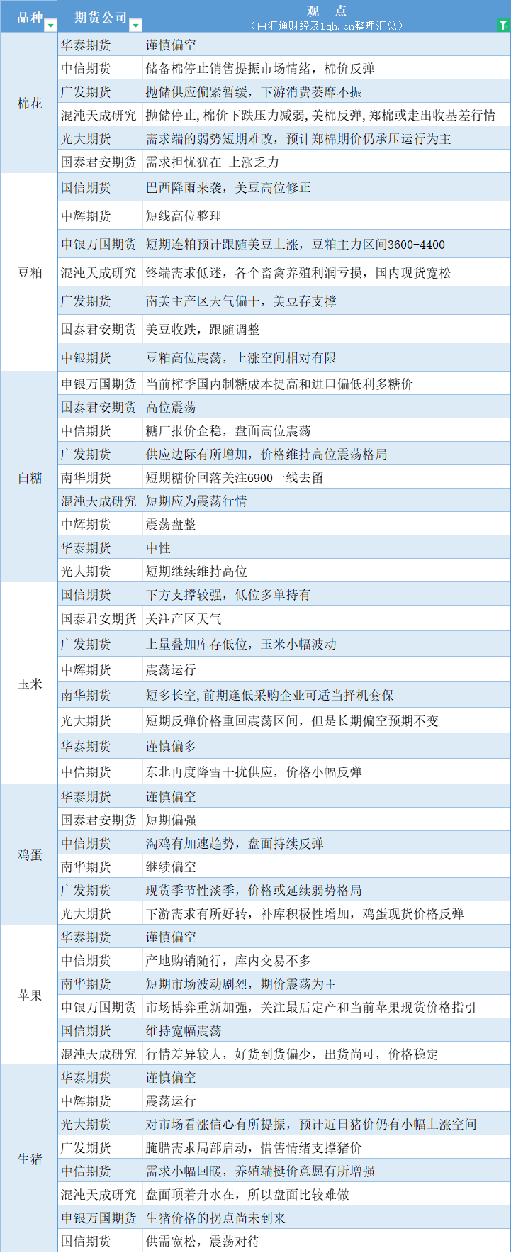 标题:期货公司观点汇总一张图:11月16日农产品(棉花、豆粕、白糖、玉米、鸡蛋、生猪等)