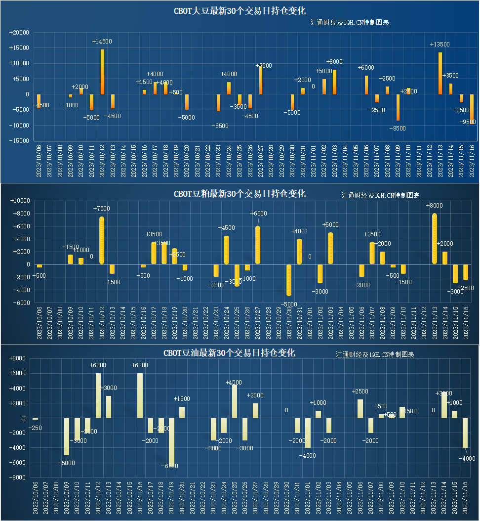 交易商估算的结果显示,大宗商品基金本周四(11月16日)增加玉米投机性净多头头寸,增加豆油、大豆、小麦、豆粕投机性净空头头寸。最近30个交易日,大宗商品基金本增加玉米、豆油、小麦投机性净空头头寸,增加豆粕、大豆投机性净多头头寸。