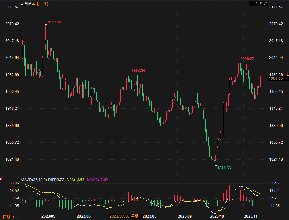 黄金现货价格周四大幅上涨,最高至1987.66,现报1983.01美元/盎司,日内涨幅1.21%。