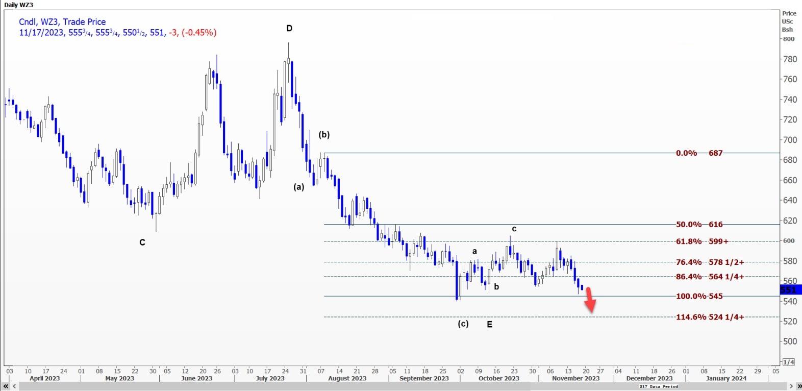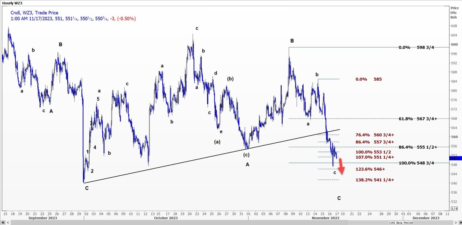 由支撑引发的反弹似乎已结束于555.5美分的阻力位附近。这种微弱的反弹被归类为向上升趋势线的回调。
