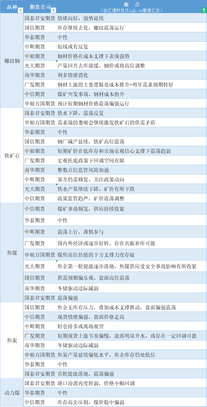 期货公司观点汇总一张图:11月20日黑色系(螺纹钢、焦煤、焦炭、铁矿石、动力煤等)