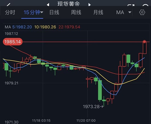 汇通财经APP讯——周一(11月20日)亚市盘中,现货黄金探底回升,早些时候一度触及21日均线附近的1973.28美元/盎司,但随后快速回升,目前交投于1981.63美元/盎司附近。,金价刚刚触及1985美元/盎司,知名财经网站FXDailyReport分析师Nicholas Kitonyi撰文称,黄金多头将把长期反弹获利目标定在2016美元/盎司左右,或更高的2050美元/盎司。