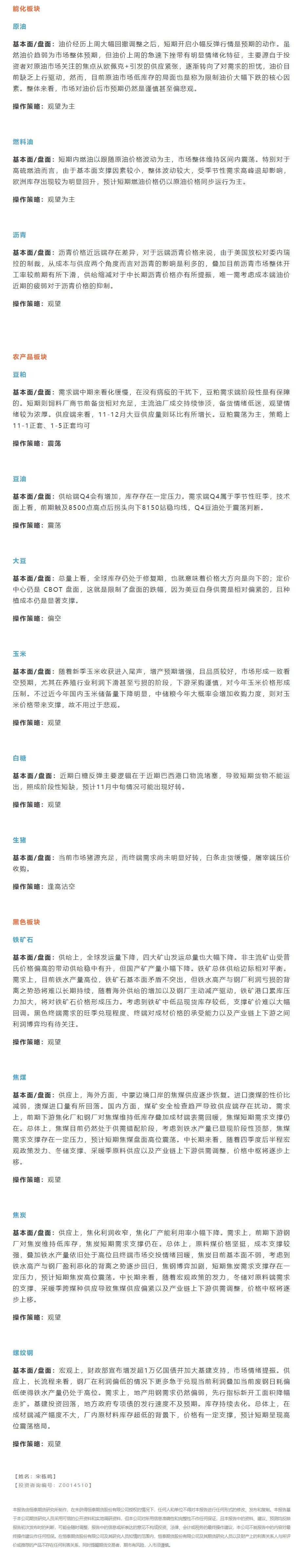 以下为恒泰期货11月20日对能源板块、黑色板块、农产品板块期货交易提醒和建议。