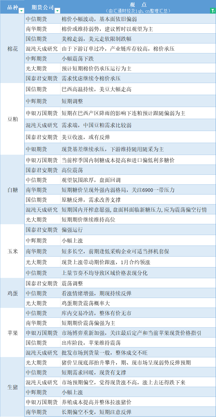 标题:期货公司观点汇总一张图:11月21日农产品(棉花、豆粕、白糖、玉米、鸡蛋、生猪等)