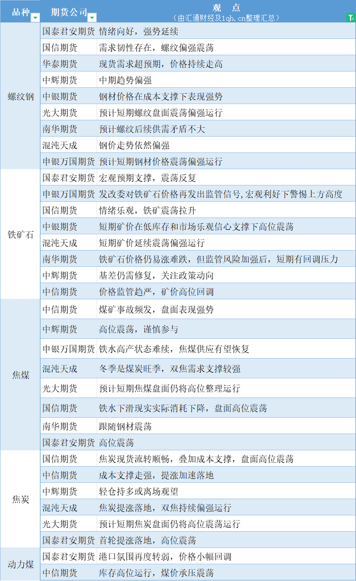 期货公司观点汇总一张图:11月21日黑色系(螺纹钢、焦煤、焦炭、铁矿石、动力煤等)