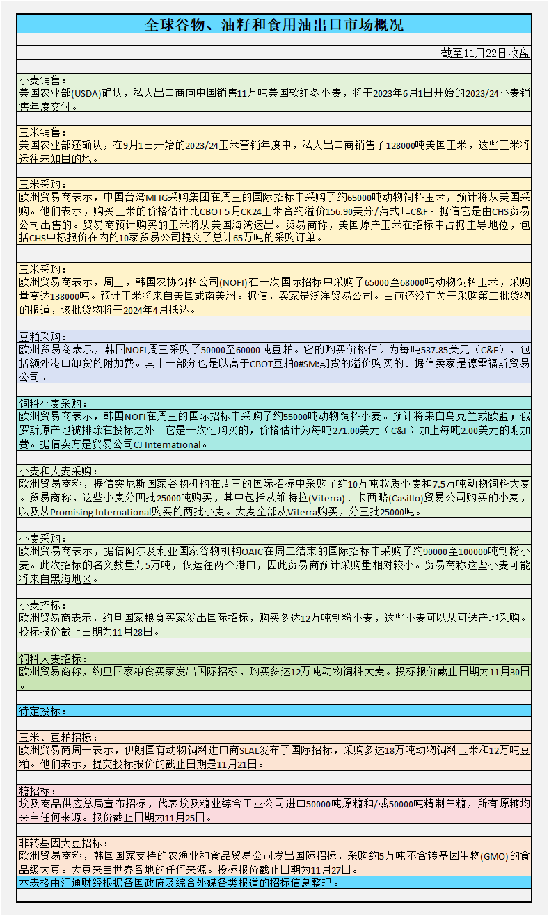 截至周三收盘,全球谷物、油籽和食用油出口市场概况: