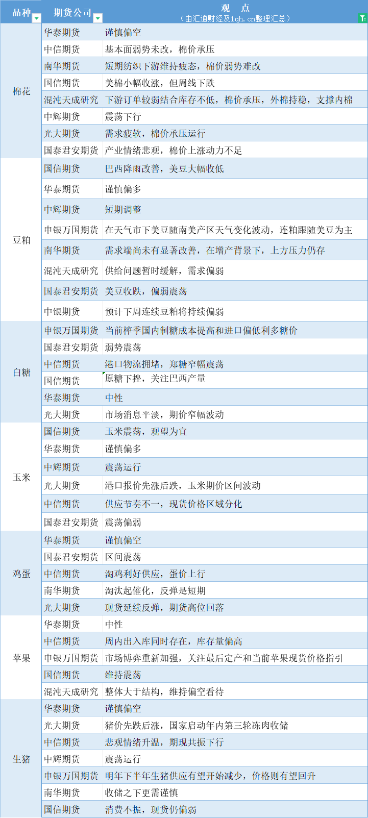 期货公司观点汇总一张图:11月27日农产品(棉花、豆粕、白糖、玉米、鸡蛋、生猪等)