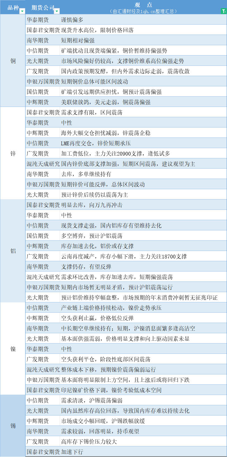 标题:期货公司观点汇总一张图:11月29日有色系(铜、锌、铝、镍、锡等)
