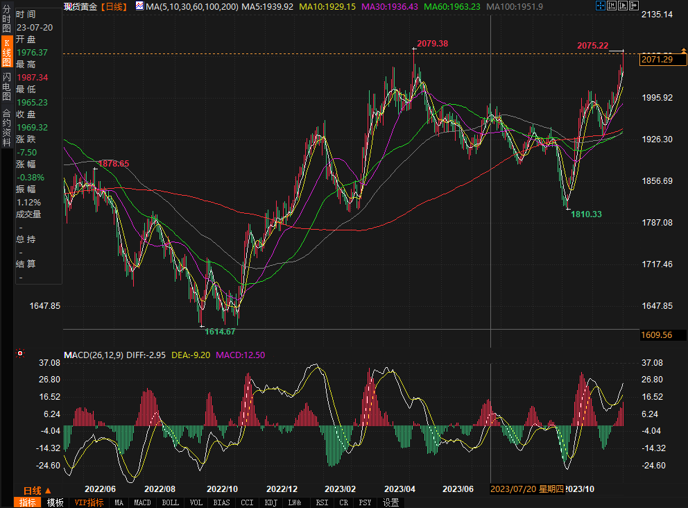 现货黄金逼近2020年8月7日所创历史最高位2075.47美元/盎司。