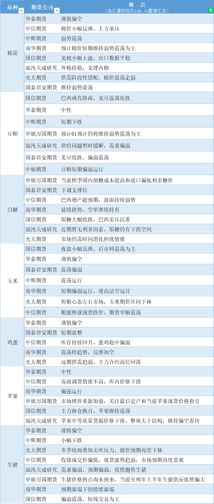 标题:期货公司观点汇总一张图:12月4日农产品(棉花、豆粕、白糖、玉米、鸡蛋、生猪等)