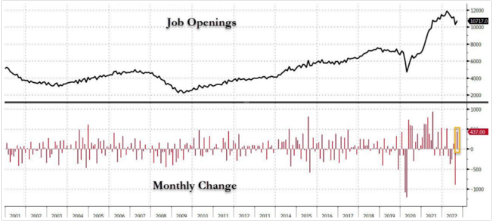 令美联储隔夜更为头疼的是,一边是债市指标继续拉响经济衰退警钟,另一边却是:劳动力市场持续紧张,可能预示着爆表的通胀仍难轻易降温!周二的一组美国就业数据,成为了在今晚美联储决议前,率先半路杀出吸引市场眼球的“程咬金”:美国9月职位空缺数意外大幅增长。9月份职位空缺数从前月修正后的1030万增至1070万,而媒体调查的经济学家的预期中值仅为980万左右。