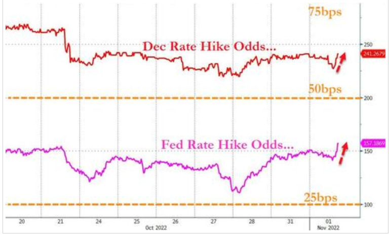 与此同时,美联储12月加息75个基点和明年2月加息50个基点的预期双双上升: