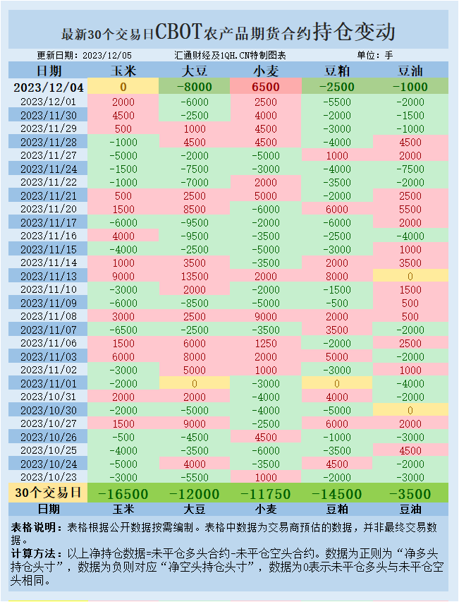 交易商估算的结果显示,大宗商品基金本周一(12月04日)增加大豆、豆油、豆粕投机性净空头头寸,增加小麦投机性净多头头寸,玉米未平仓多头与未平仓空头相同。最新30个交易日,大宗商品基金增加小麦、玉米、豆油、豆粕、大豆投机性净空头头寸。
