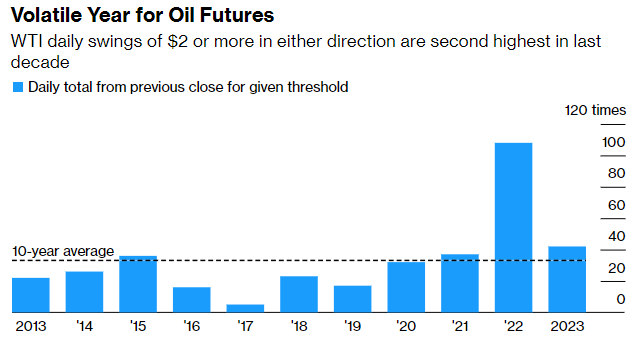 美国原油基准价格的近期极度波动。截至上周五的收盘,西德克萨斯中质原油期货在每天的交易中以超过2美元的幅度上下波动了总共42次。尽管这与2022年的激增相比显得相对较小,但超过了过去10年的平均水平。这种波动主要是由于需求不确定性、库存担忧以及OPEC+持续的减产措施。然而,这还不是全部:投机力量也发挥了一定作用。周一,西德克萨斯中质原油期货和布伦特原油期货均下跌。