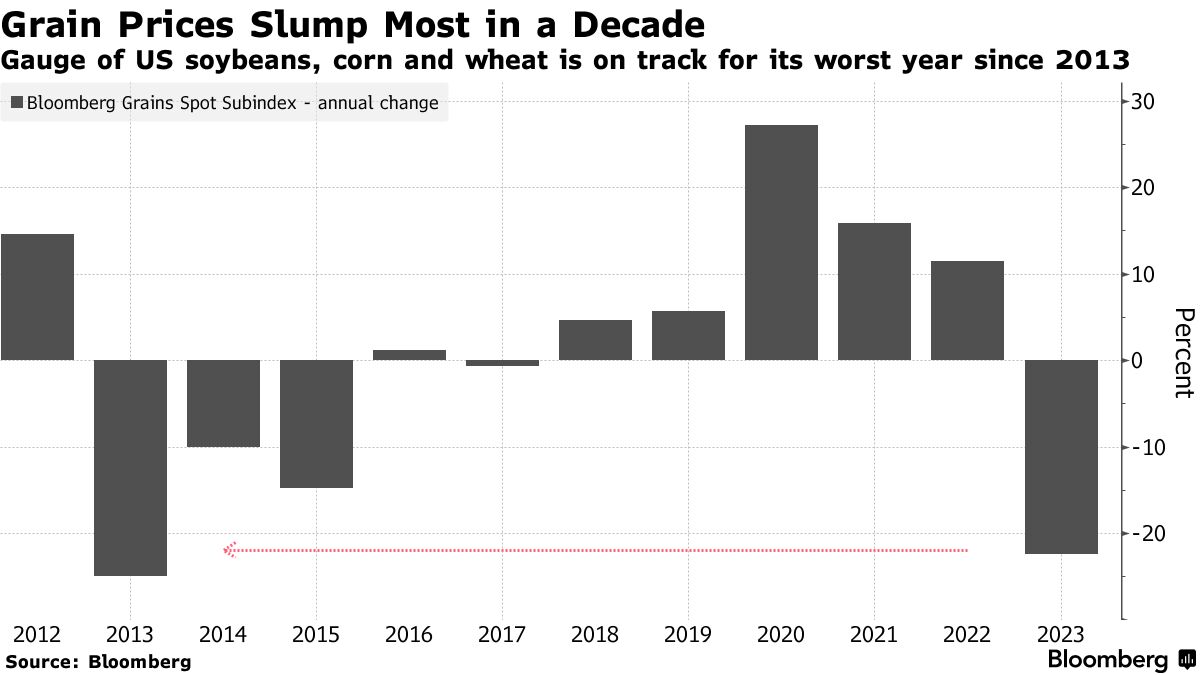 由于美国大丰收,尤其是玉米,以及全球谷物供应超出预期,今年谷物价格受到重创。Bloomberg对大豆、玉米和小麦近期期货合同的指数显示,2023年跌幅超过20%,有望迎来10年来最严重的下滑。交易商们将在周五等待美国农业部发布的每月WASDE报告,以获取对国内外收成的最新评估。