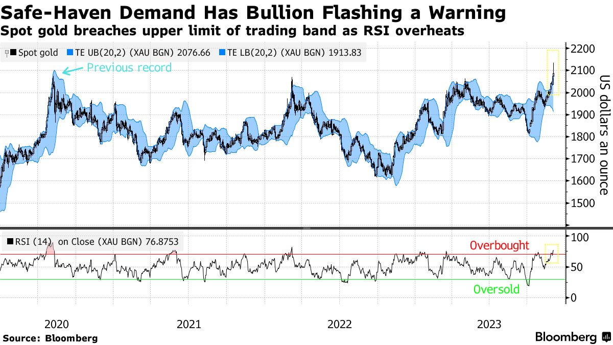 周一亚洲交易开始时,即期黄金价格上涨了3.1%,一度突破每盎司2100美元,然后回吐了这些涨幅甚至更多。自从10月初以来,受到以色列-哈马斯战争的避险需求和预期美联储明年货币政策将转向宽松而刺激,黄金价格已经上涨约12%。在这个过程中,黄金已经突破了其交易区间的上限,这是围绕移动价格平均线构建的技术指标,通常可能预示着市场走势的逆转。与此同时,其14天的相对强度指数超过了70,表明这一上涨可能过于迅猛。