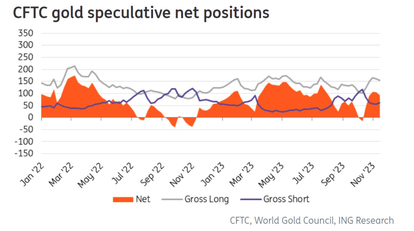 然而,金市的其他领域已经发生了变化。她指出:“自10月下旬以来,反映黄金市场情绪的净多头头寸已经转为正值,因以色列-哈马斯冲突爆发,而现货价格大幅上涨。”她注意到:“截至10月29日,COMEX的净多头头寸环比上升了137%,得到了地缘政治担忧的支持。”