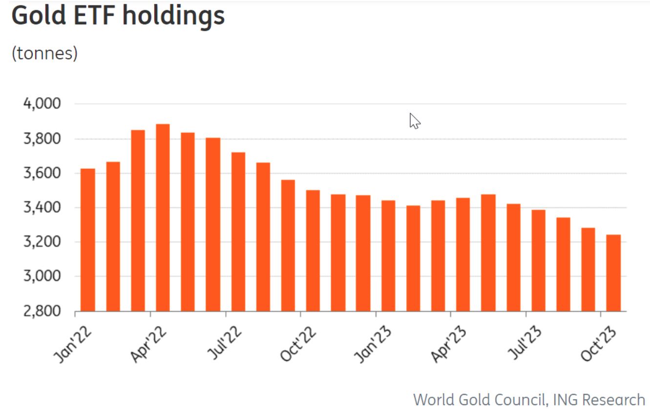 Manthey写道:“尽管全球黄金ETF的净流出在10月份继续,但比9月份的速度放缓。截至目前,全球净流出总额达到130亿美元,相当于黄金持仓减少了225吨。”