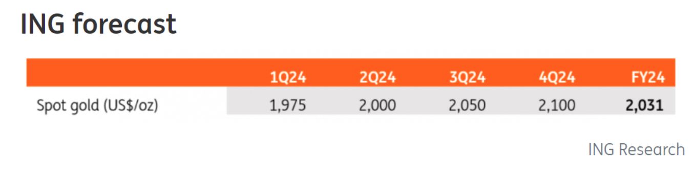 标题:荷兰国际集团:三大要素划定2000美元下限,2024年黄金走势展望