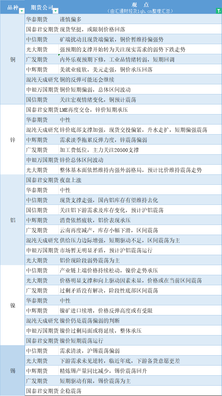 标题:期货公司观点汇总一张图:12月7日有色系(铜、锌、铝、镍、锡等)
