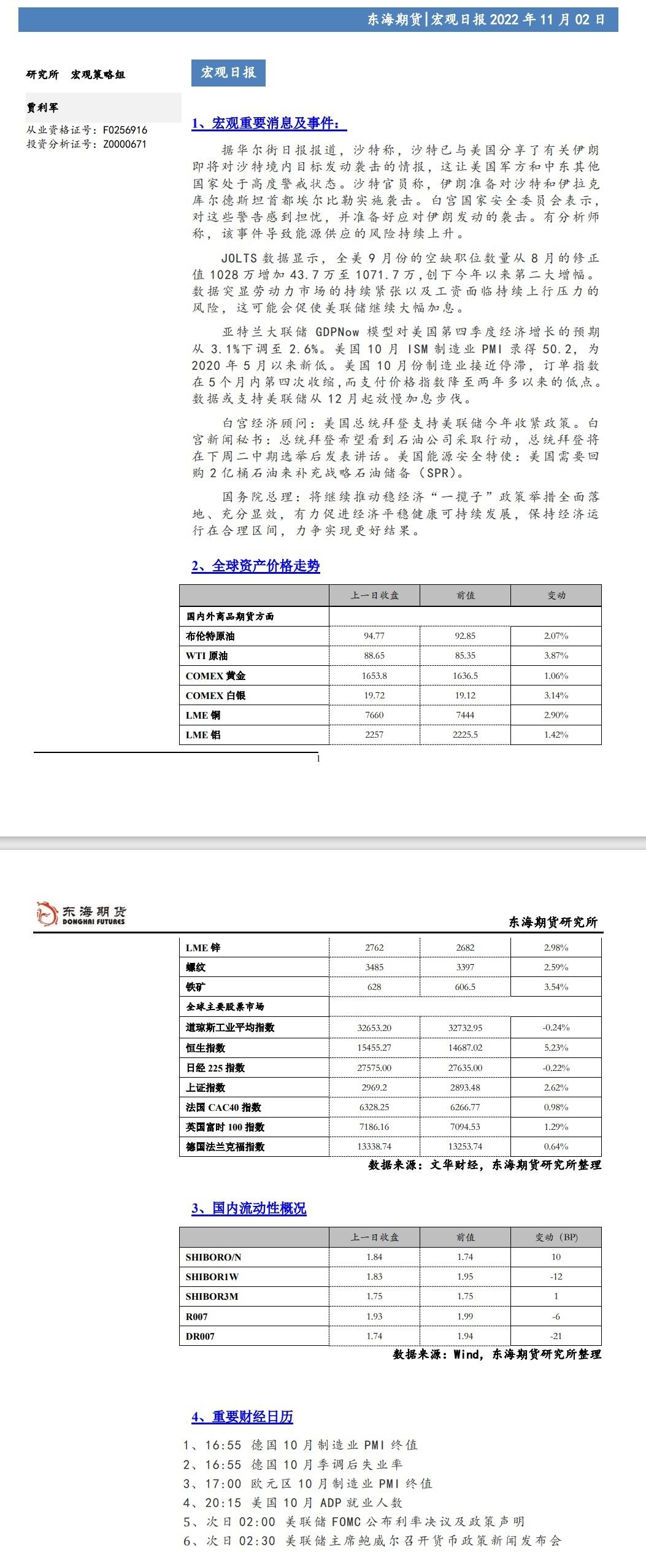 标题:【东海期货11月2日宏观日报】:美国经济和就业数据超预期,短期强化美联储加息预期