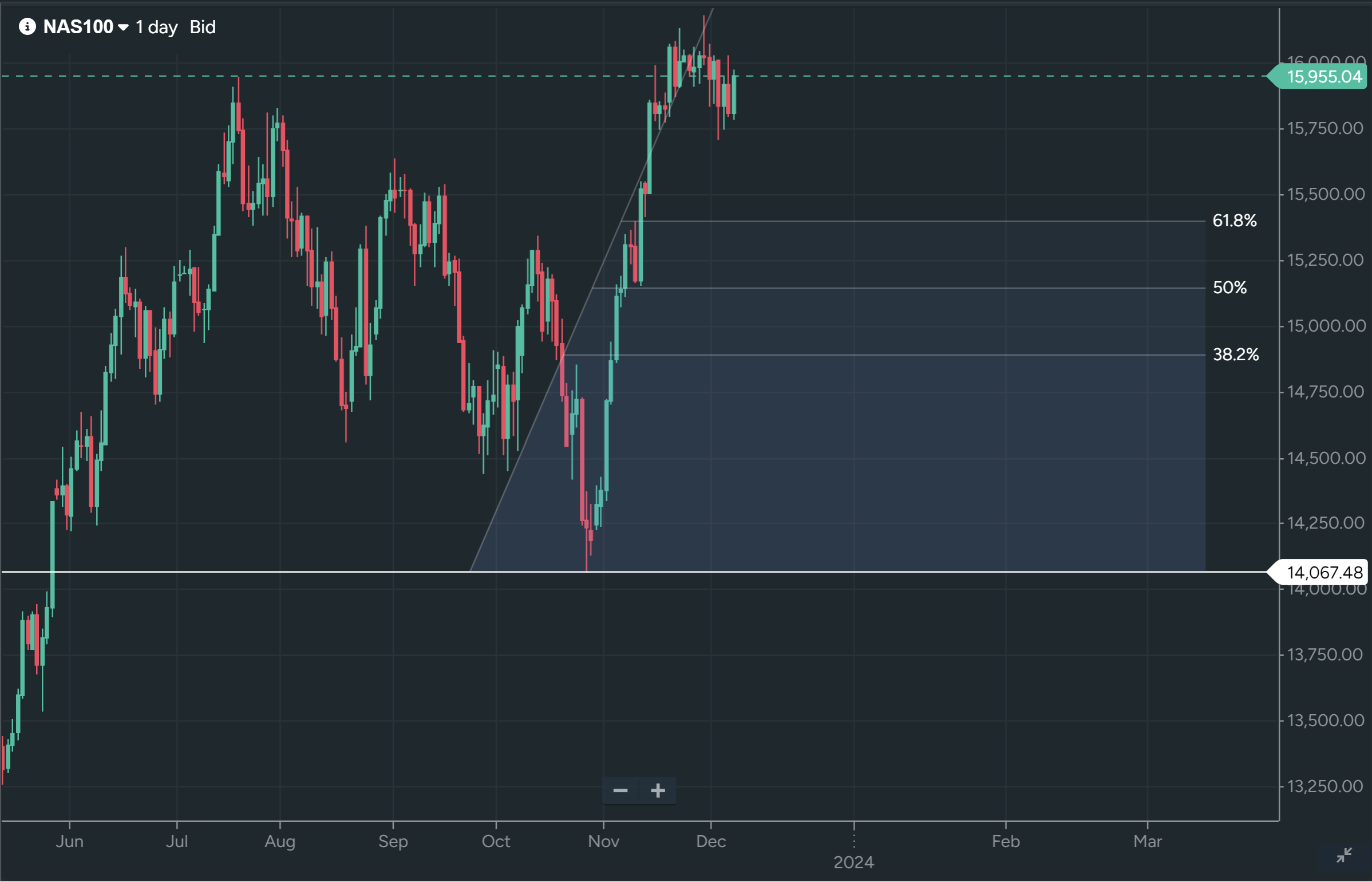 斐波纳契工具表明纳斯达克100指数可能在14877和15379之间存在支撑。下降到这一区间是否会破坏一年一度的“圣诞行情”?不会,只有在跌破10月份低点14066的极端情况下才可能出现这种情况。
