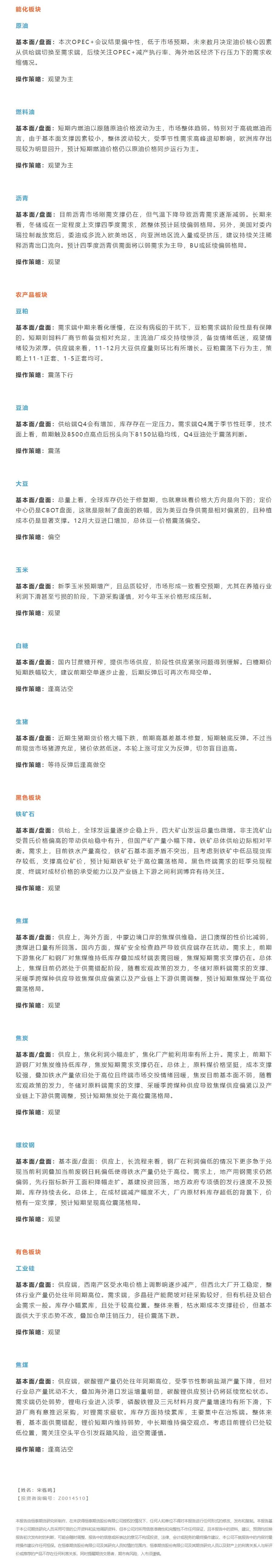 以下为恒泰期货12月8日对能源板块、黑色板块、农产品板块期货交易提醒和建议。