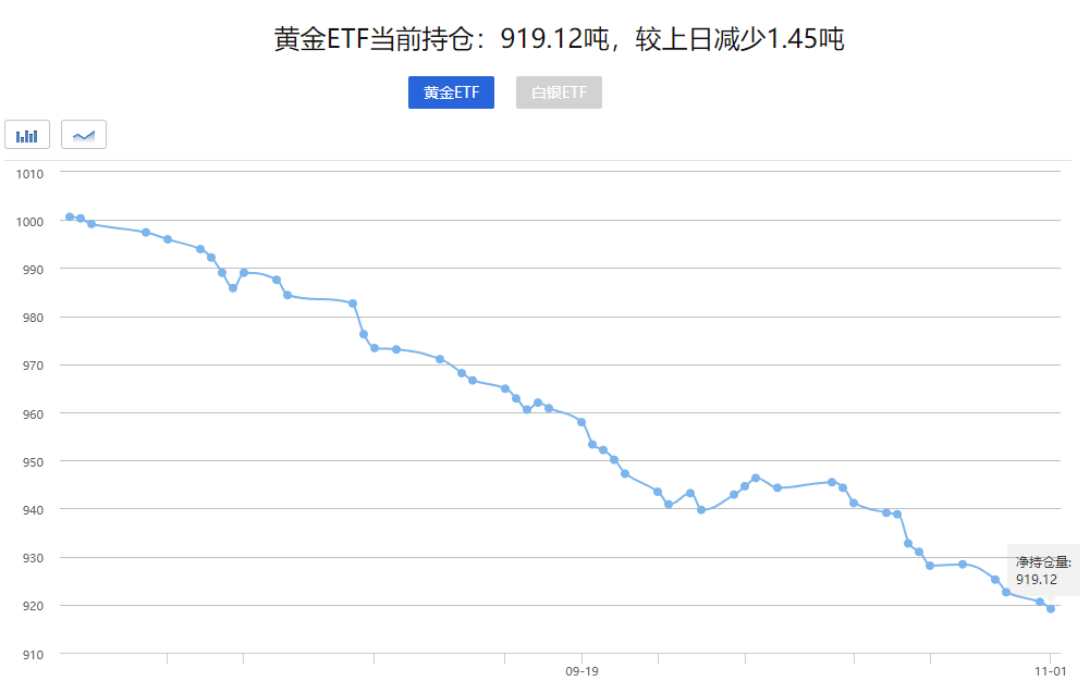 【黄金ETF持仓持续下降】数据显示,全球最大的黄金ETF持仓周二减少1.45吨,为连续四个交易日下降,至919.12吨,为2020年3月20日以来新低,这暗示多数机构和专业投资者在中长线仍看空黄金后市。