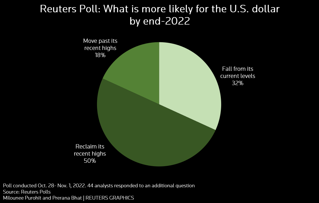 在10月28日至11月1日的路透调查中,超过三分之二的分析师(44人中有30人)认为,到年底时美元将重返或超越近期高点。其余14人认为美元将低于目前水平。