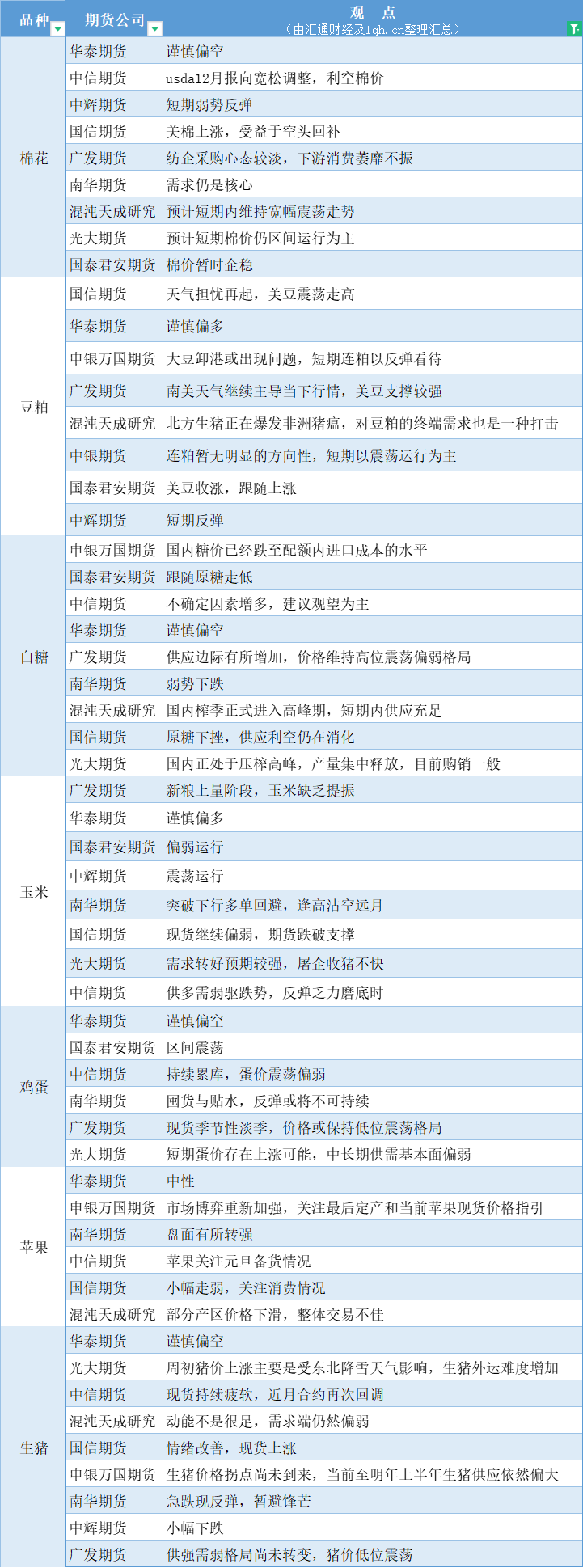 标题:期货公司观点汇总一张图:12月12日农产品(棉花、豆粕、白糖、玉米、鸡蛋、生猪等)