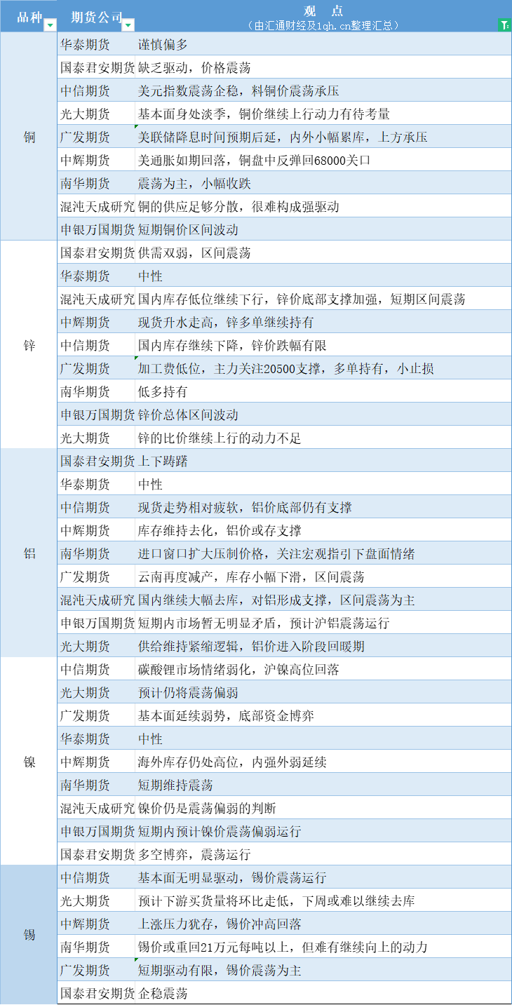 标题:期货公司观点汇总一张图:12月13日有色系(铜、锌、铝、镍、锡等)
