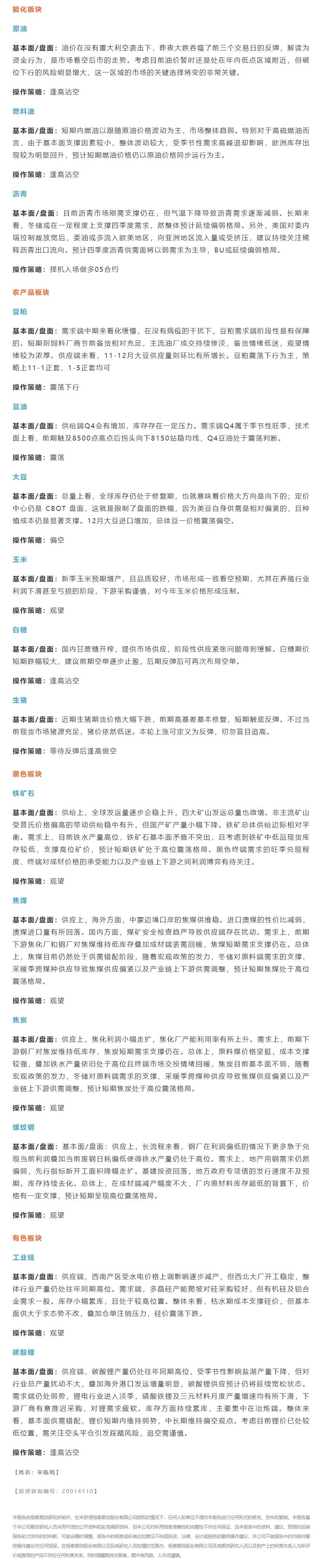 以下为恒泰期货12月13日对能源板块、黑色板块、农产品板块期货交易提醒和建议。