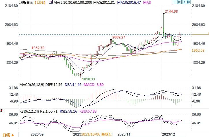 汇通财经APP讯——周四(12月14日),金价周四触及10日高位2047.49美元/盎司,收盘上涨0.5%报2,036.69美元/盎司。