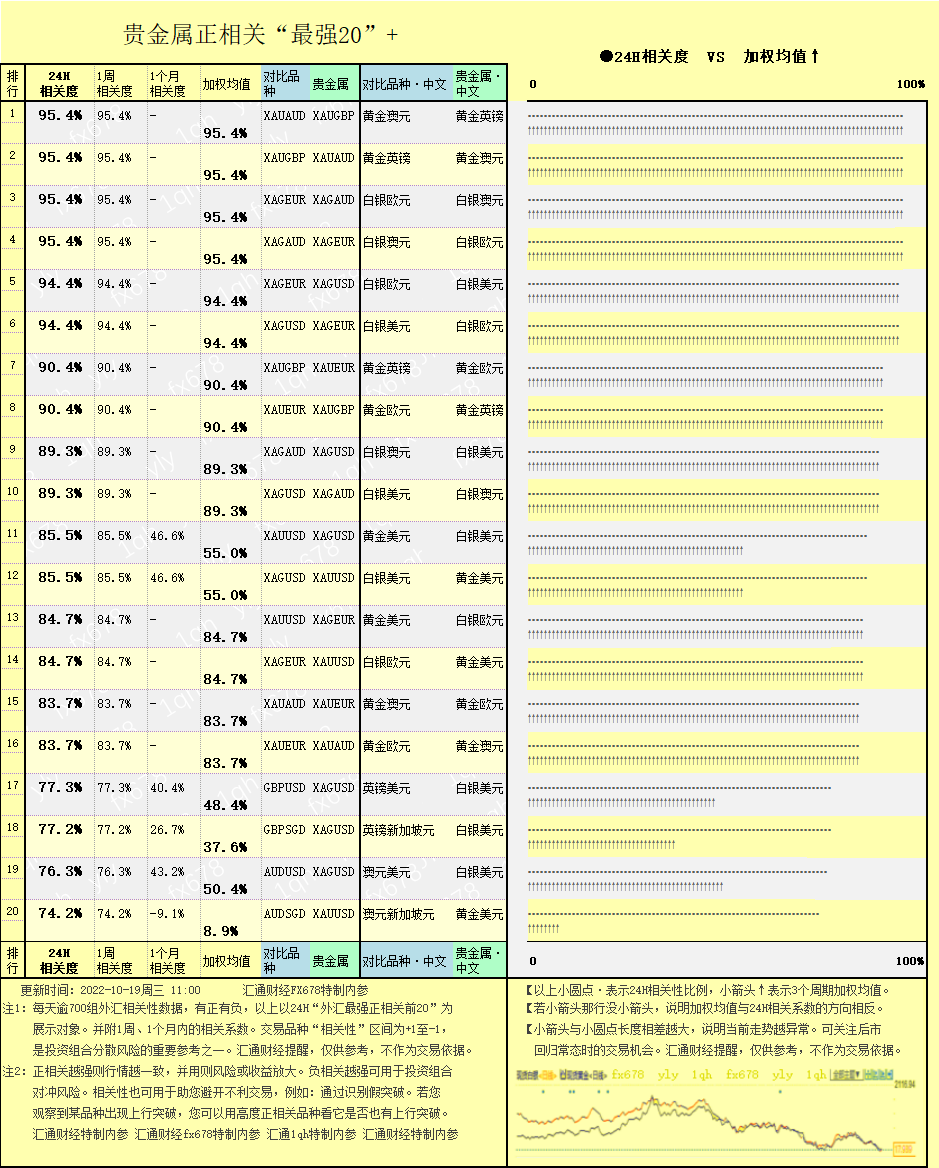 汇通财经APP讯——图解:外汇相关性+贵金属相关性一览(2023/12/15),分以下四张图分别做对比展现。每天逾700组外汇或贵金属相关性数据,有正有负,抽取24H“外汇最强相关性前20”为展示对象,并附1周、1个月内的相关系数。相关性也可用于助您避开不利交易,例如:通过识别假突破。又如,套期保值的用户,如果操作对象是非热门品种,没有渠道做线上操作,这种情况,可以寻找与之关联度高度匹配的热门品种进行操作。