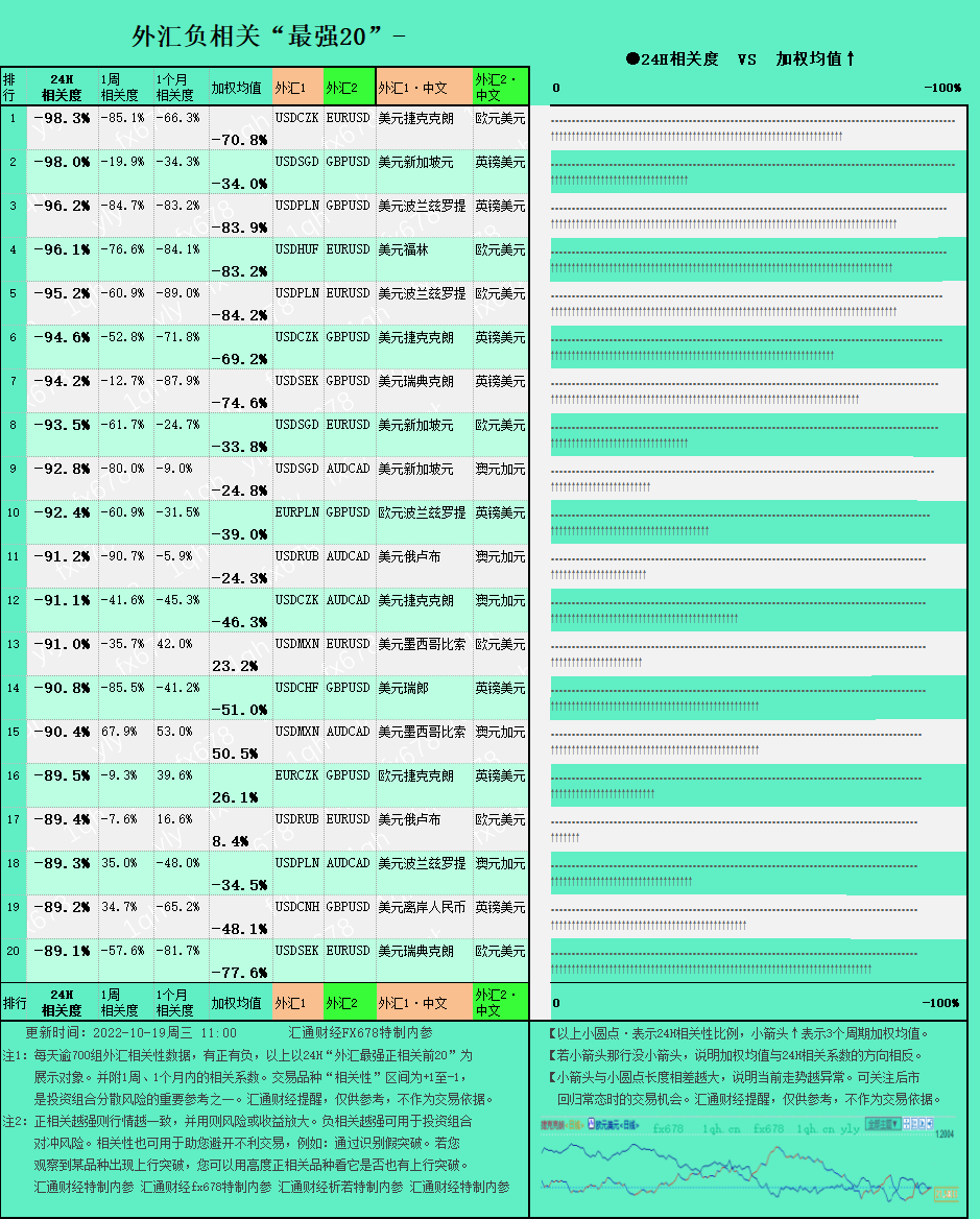 如下图2:过去24小时交易时间内,【外汇负相关】最强三个分别是:美元捷克克朗(USDCZK) VS 欧元美元(EURUSD)的外汇负相关强度达到-98.30%。美元新加坡元(USDSGD) VS 英镑美元(GBPUSD)的外汇负相关强度达到-98.00%。美元波兰兹罗提(USDPLN) VS 英镑美元(GBPUSD)的外汇负相关强度达到-96.20%。汇通财经提醒,更多参考本文如下表格。