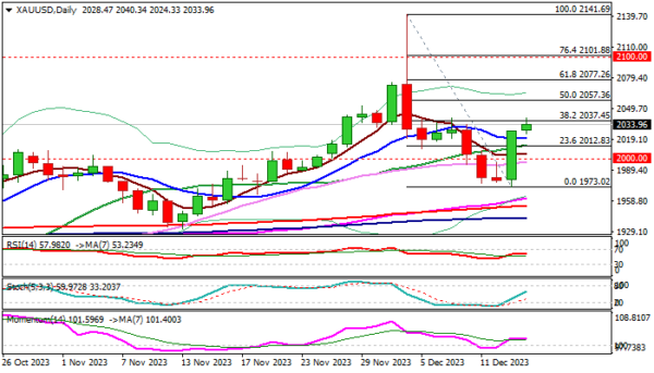 金价已经回到2000美元/盎司关口上方,并一度突破关键阻力2037美元/盎司(2141-1973美元/盎司跌势的38.2%斐波那契回撤位)。