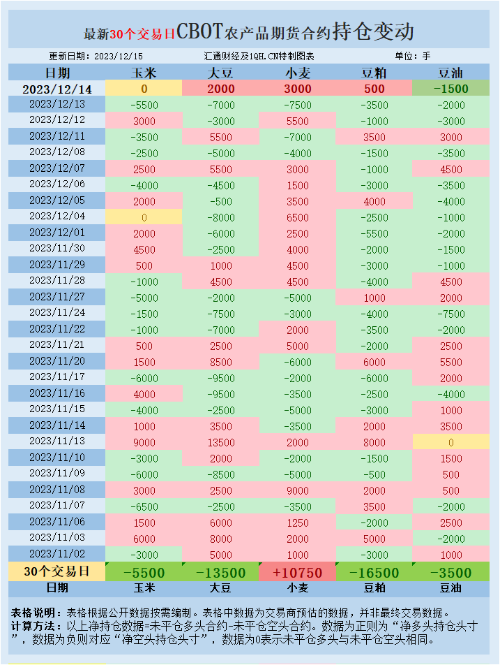交易商估算的结果显示,大宗商品基金本周四(12月14日)增加大豆、豆粕、豆油投机性净多头头寸,增加小麦投机性净空头头寸,玉米未平仓多头与未平仓空头相同。最新30个交易日,大宗商品基金增加豆油、玉米、豆粕、大豆、投机性净空头头寸,增加小麦投机性净多头头寸。