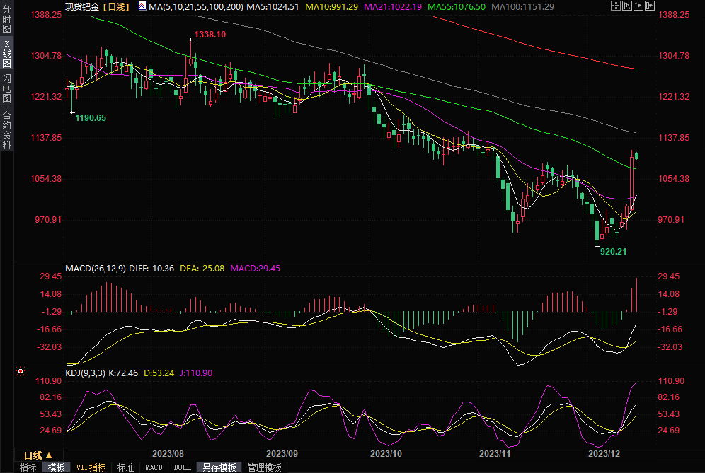 现货钯金周四收市暴涨11.61%,报1103.45美元/盎司。