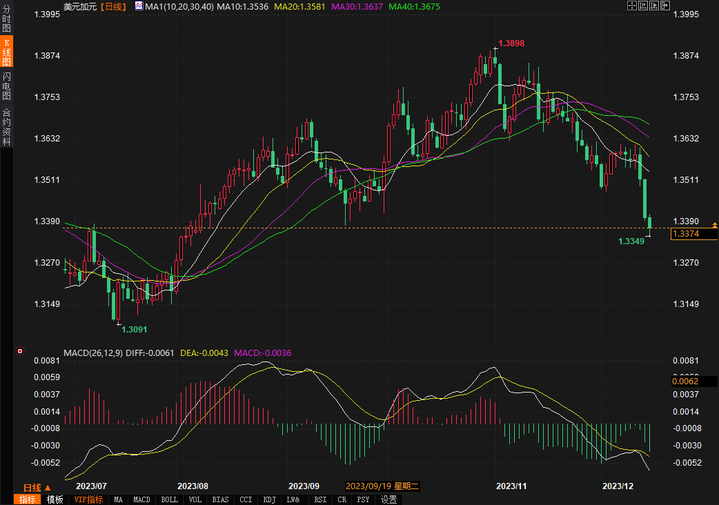 美元/加元连续第三个交易日下滑,跌入8月中旬位置,现报1.33648,下跌0.30%。