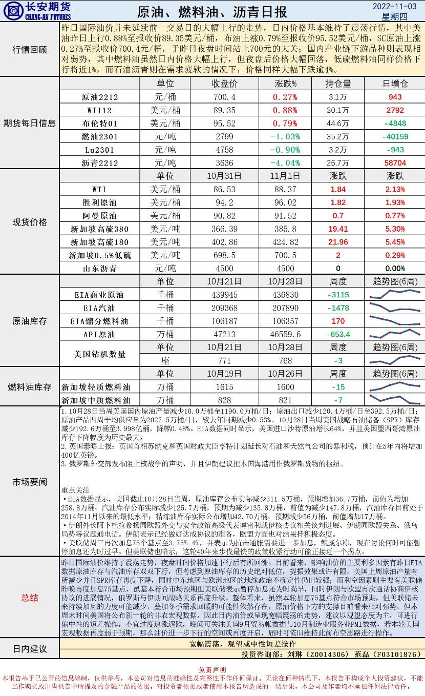 11月3日,长安期货发布原油早评,认为原油将宽幅震荡,建议观望或中性短差操作。