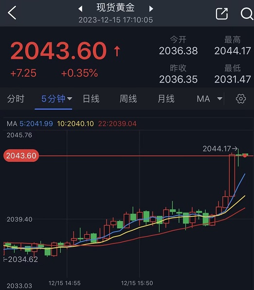 北京时间17:10,现货黄金报2043.60美元/盎司。